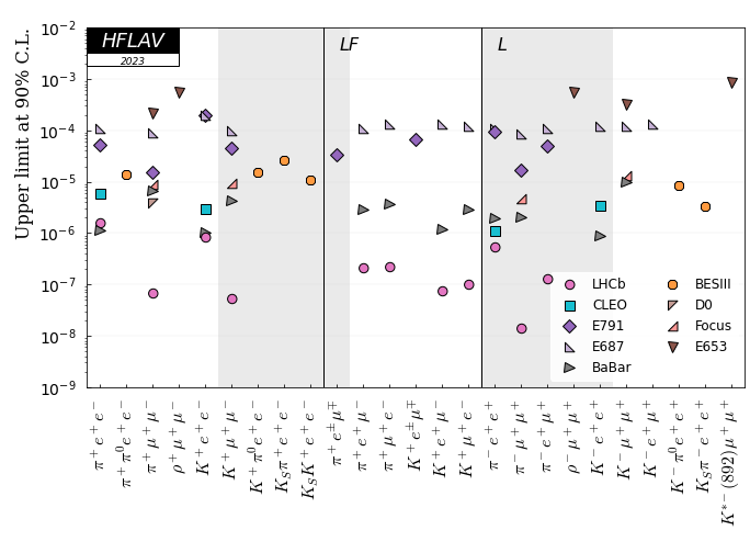 | K+μ+e- | 120.0 | E687 | P.L. Frabetti et al., Phys. Lett. B398 (1997) 239 |