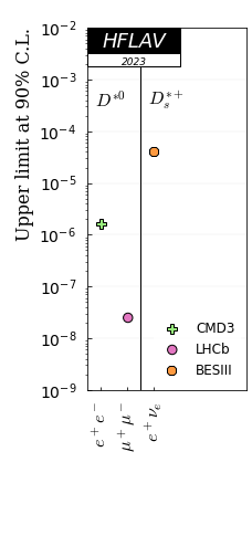 D*(2007)0→e+e- 1.7 CMD-3 D.-N. Shemyakin et al., Phys. At. Nucl. 83 (2020) 954 D*(2007)0→μ+μ- 0.026 LHCb R. Aaij et al., arXiv:2304.01981 Ds*+→e+νe 40.0 BESIII M. Ablikim et al., arXiv:2304.12159