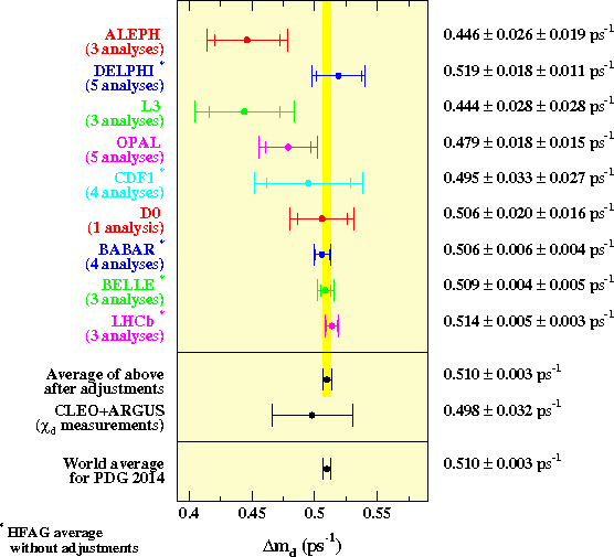 | Δmd = 0.510 ± 0.003 ps−1 | from time-dependent measurements at ALEPH, DELPHI, L3, OPAL, CDF, D0, BABAR, BELLE, LHCb |