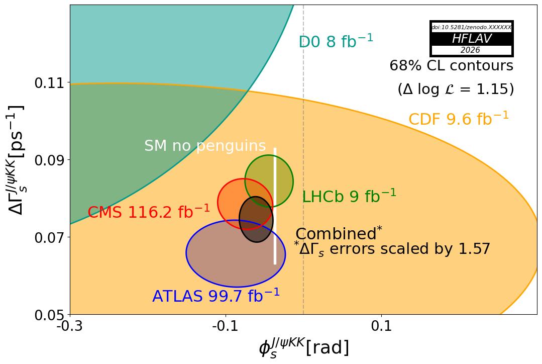 The plots below show some of the results of the multi-dimensional fits, including all on the left and only the Bs → J/ψφ analyses on the right. The plots on the top show, in the (φsccs, ΔΓs) plane, the individual 68% confidence-level contours of ATLAS, CMS, CDF, D0 and LHCb, their combined contour (black solid line and shaded area), as well as the Standard Model predictions (very thin white rectangle). The prediction for φsccs is taken as the indirect determination of −2βs via a global fit to experimental data within the Standard Model, −2βs = −0.0377 ± 0.0006 [J. Charles et al. (CKMfitter), Phys. Rev. D91, 073007 (2015), updated with Summer 2025 results] and −0.0367 ± 0.0010 [M. Bona et al. (UTfit), Rend. Lincei Sci. Fis. Nat. 34, 27 (2023), updated with Summer 2025 results], while the Standard Model prediction for ΔΓs is 0.078 ± 0.015 ps−1 [U. Nierste, P. Reeck, V. Shtabovenko, and M. Steinhauser, arXiv:2512.07949], The combined result is consistent with these predictions. The plots on the bottom show, in the (Γs, ΔΓs) plane, the individual 68% confidence-level contours of ATLAS, CMS, CDF, D0 and LHCb, their combined contour (black solid line and shaded area), as well as the Standard Model prediction for ΔΓs (horizontal gray band). Because of tensions between the measurements, the errors on Γs and ΔΓs have been scaled by the indicated factors (the ellipses representing the results of each experiment are shown before scaling, while the combined ellipses include the scale factors).